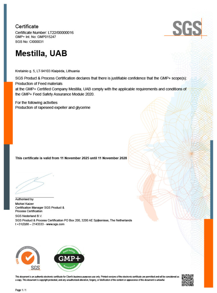 MESTILLA yra įdiegtos kokybės, aplinkos apsaugos, darbuotojų saugos ir sveikatos, taip pat pašarų saugos vadybos sistemos, kurios yra sertifikuotos pagal tarptautinių standartų ISO 9001, ISO 14001, ISO 45001:2018, GMP+ reikalavimus.